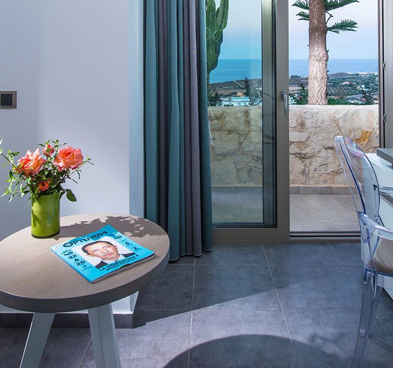 The Superior Suite with Sea View is ideally suited to 2-3 people who wish to spend relaxing holidays in Agia Pelagia, Crete. Featuring two balconies with a patio, guests can soak up the Cretan sea views from morning till night. Sized at 35 m², the contemporary and fresh design of its interiors will instantly soothe your senses, while its clever space allocation maximises comfort and style. It includes a seating area where guests can unwind, while there is the option of accommodating a third person on the sofa bed. The suite is fitted with all the modern day amenities for ensuring your convenience, as well as a private entrance that offers privacy of access.