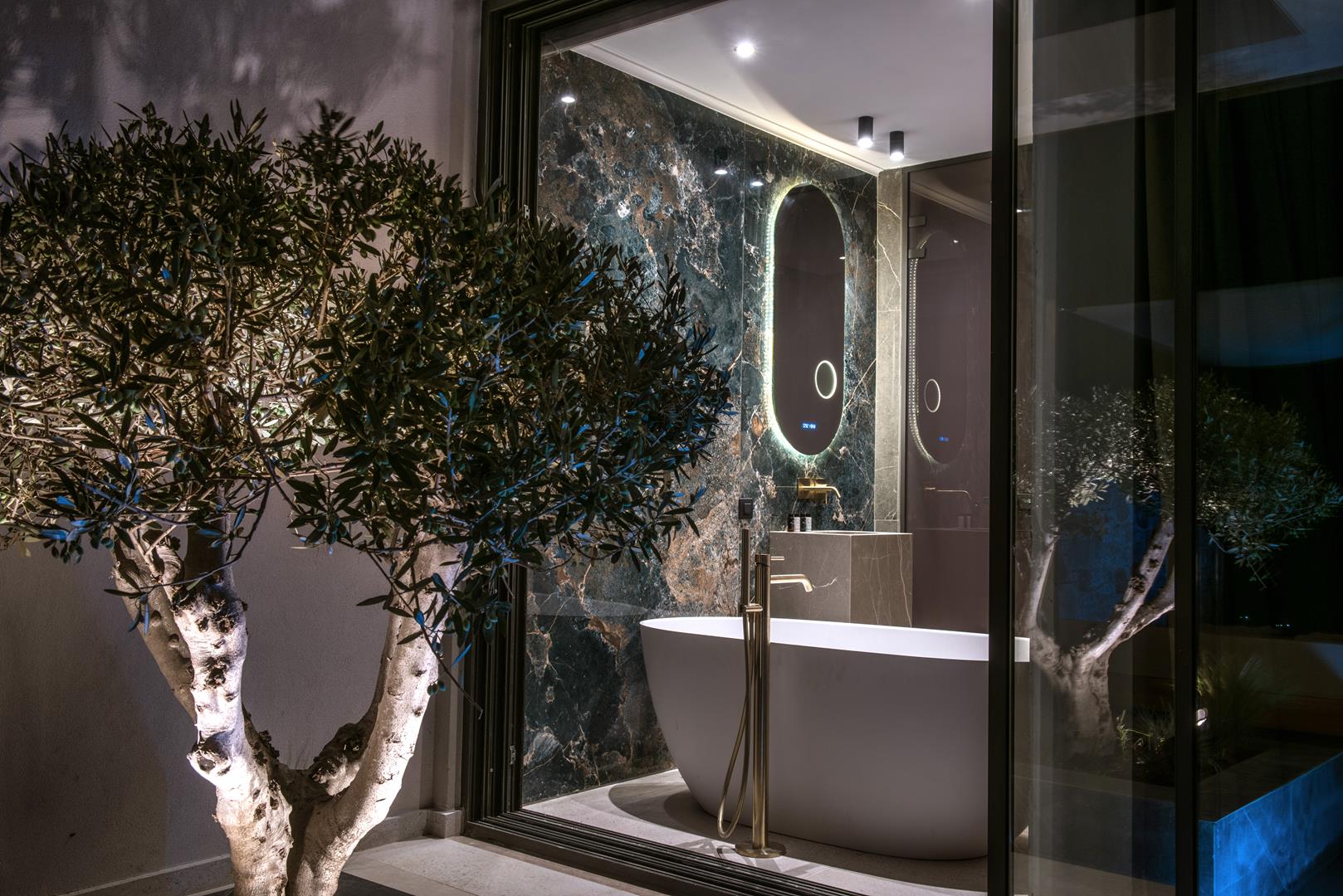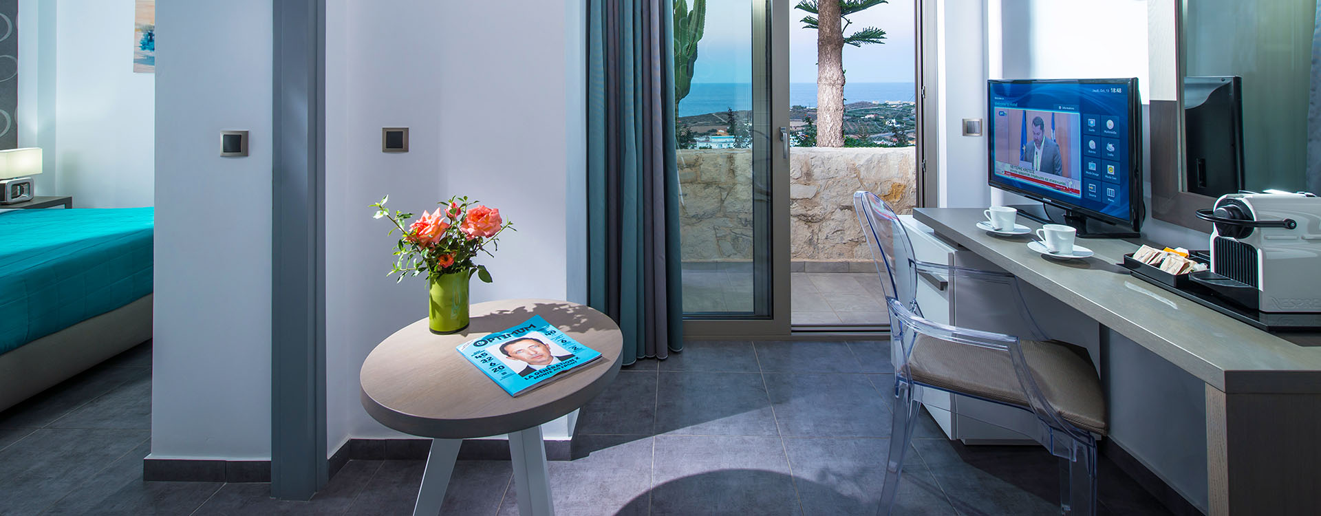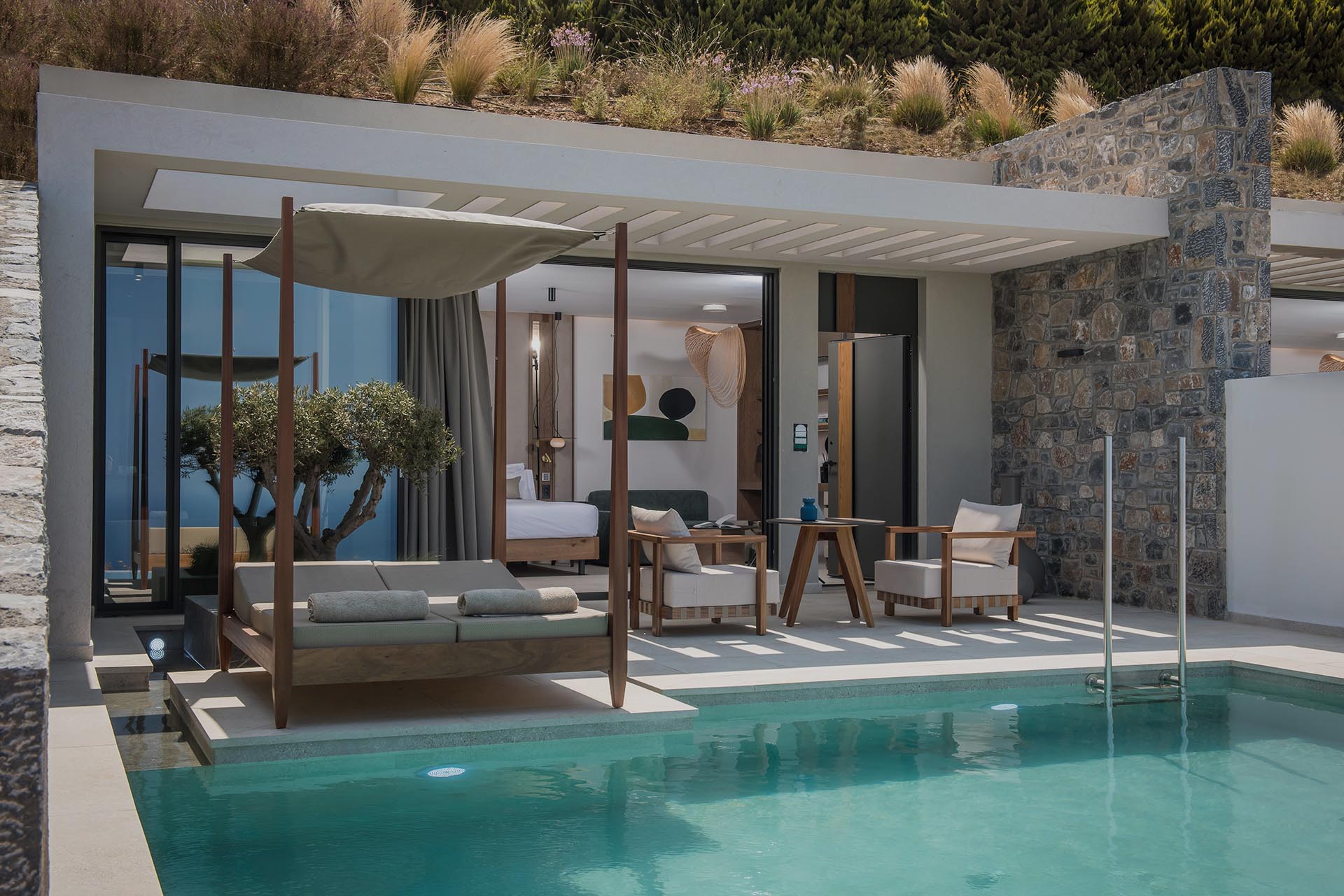 Our Cave Suite Private Pool with Garden View is 30 m² and will absolutely enthuse guests who are seeking a holiday with a pampering element. Apart from the sensational Cretan sea view from the balcony, guests of this suite can immerse into newfound levels of relaxation in the bedside spa bath. Fitting one person at a time, the spa bath will enhance the feeling of rejuvenation that each holiday aims at achieving. The bathroom has an enjoyable rain shower too, as well as all the modern day amenities to guarantee guests’ comfort.
