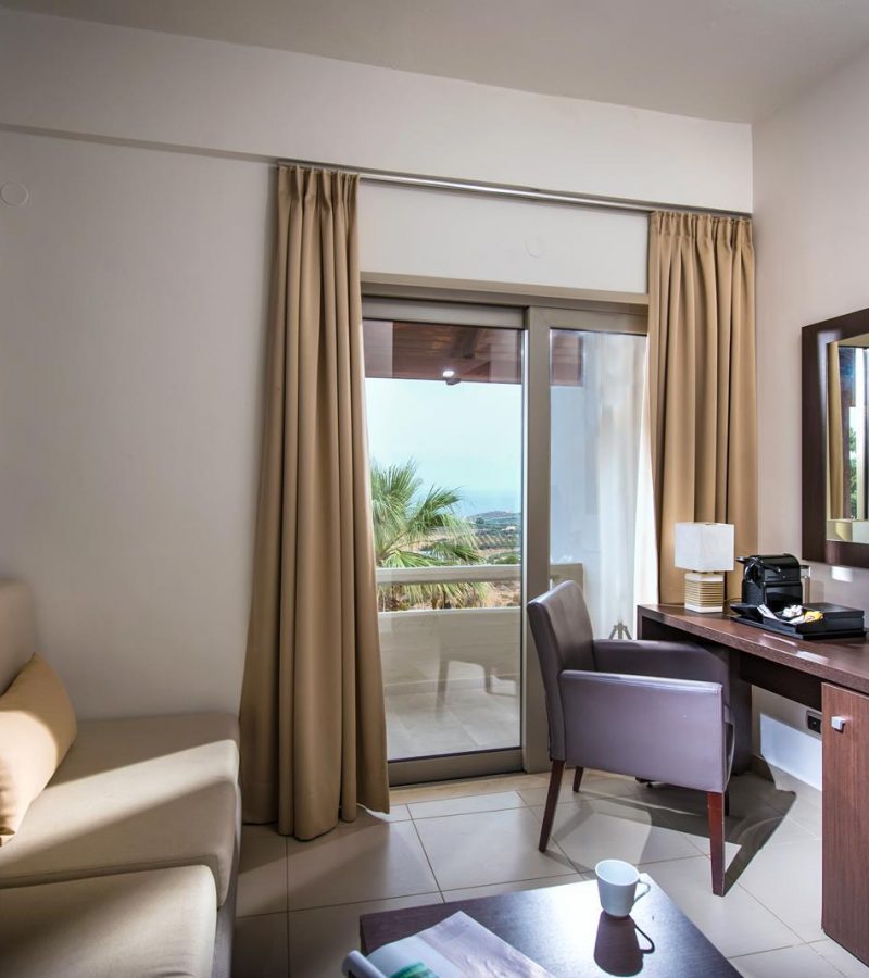 Η Deluxe Σουίτα με Θέα στη Θάλασσα προσφέρει θέα στο κρητικό πέλαγος, η οποία χύνεται στο εσωτερικό της από όχι μόνο ένα, αλλά δύο μπαλκόνια. Μια πιο άνετη σουίτα 35τ.μ. με διάσπαρτες πολυτελείς πινελιές, επιτρέπει στους επισκέπτες της να αισθάνονται σαν στο σπίτι τους στην Αγία Πελαγία της Κρήτης. Κατάλληλο για φιλοξενία έως 3 ατόμων, αυτή η σουίτα διαθέτει άνετο καναπέ-κρεβάτι για το τρίτο άτομο. Διαθέτει ένα μοντέρνο ντιζάιν: το μπάνιο είναι εξοπλισμένο με μπανιέρα και η σουίτα περιλαμβάνει όλες τις απαραίτητες ανέσεις για μια πραγματικά συναρπαστική εμπειρία διαμονής.